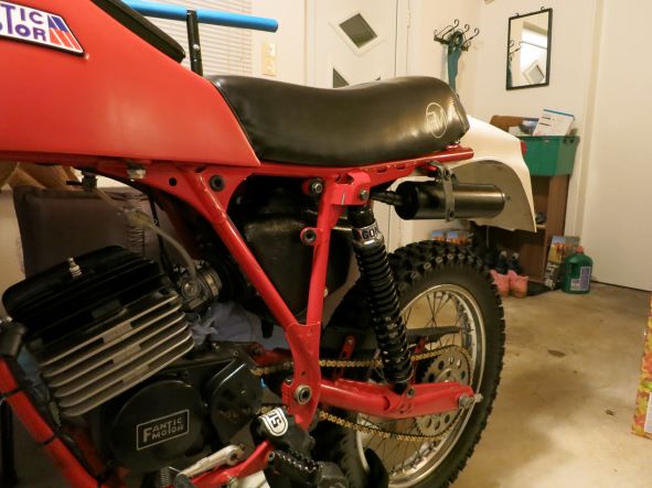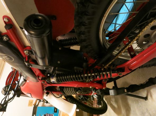 Die Federbeine sind natürlich nicht original! Die Originalen sahen übel aus, Ölverlust und ich habe auf die Schnelle niemand auftreiben können, der sie überholt. Die einzige Möglichkeit relativ schnell in 390mm Federbeine zu bekommen war bei Wilbers eine Sonderanfertigung von Hagon-Federbeinen. Passen meiner Meinung nach farbliche ganz gut. Scheinen aber etwas weich. Ist zumindest erstmal eine Notlösung um fahren zu können....