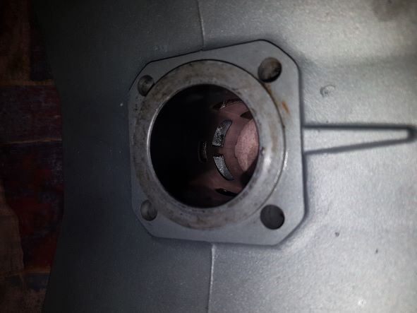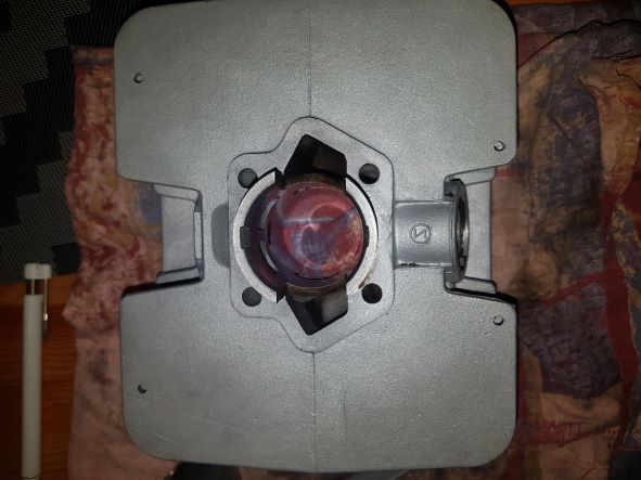 Nun ist mir aufgefallen das auf dem Kolben kein Richtungspfeil ist. Wenn das zusätzliche Loch Richtung Einlaß zeigt, dann wird es durch den Steg weitestgehend verdeckt. Allerdings hat der Zylinder über dem Einlaß eine Kerbe/Vertiefung wo das Loch im Kolben dran vorbei gleitet. Die Stelle im Kolben wo der Ringstoß ist, läuft im Zylinder immer an einem Kanal vorbei, egal wie ich ihn drehe. Ist m.E. nicht so optimal da sich der Ring ja dort aufhängen und brechen kann.