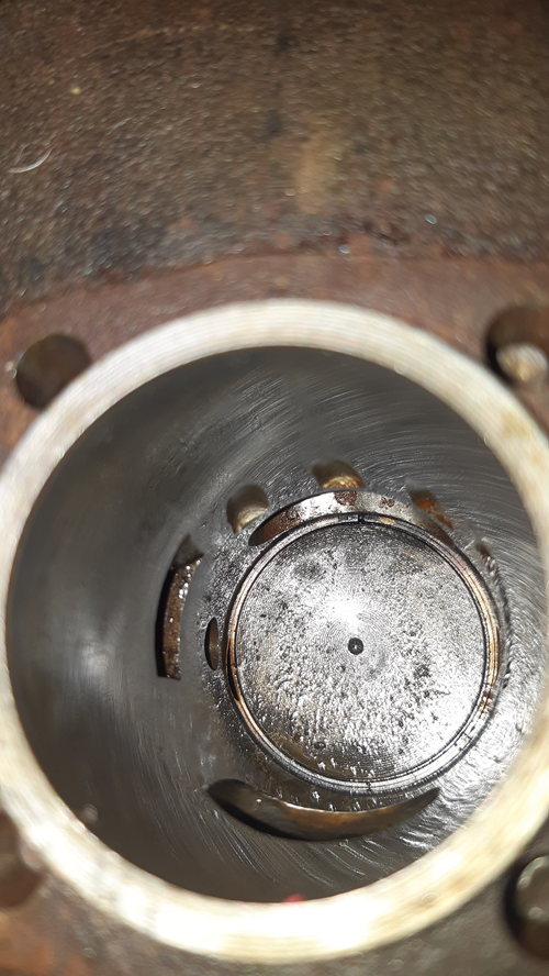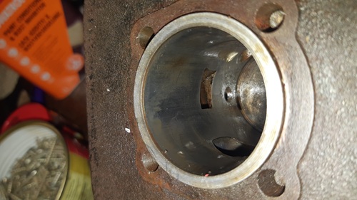 Der Kolben hat zwar nicht die manchmal zu sehenden Löcher über dem Bolzen, der Zylinder hat aber Löcher in der Laufbahn. Einen großen Auslass, und, das war mir jetzt neu, drei schräge Vertiefungen über dem Einlass. Soll wohl eine Art Hilfsüberströmer sein oder so.