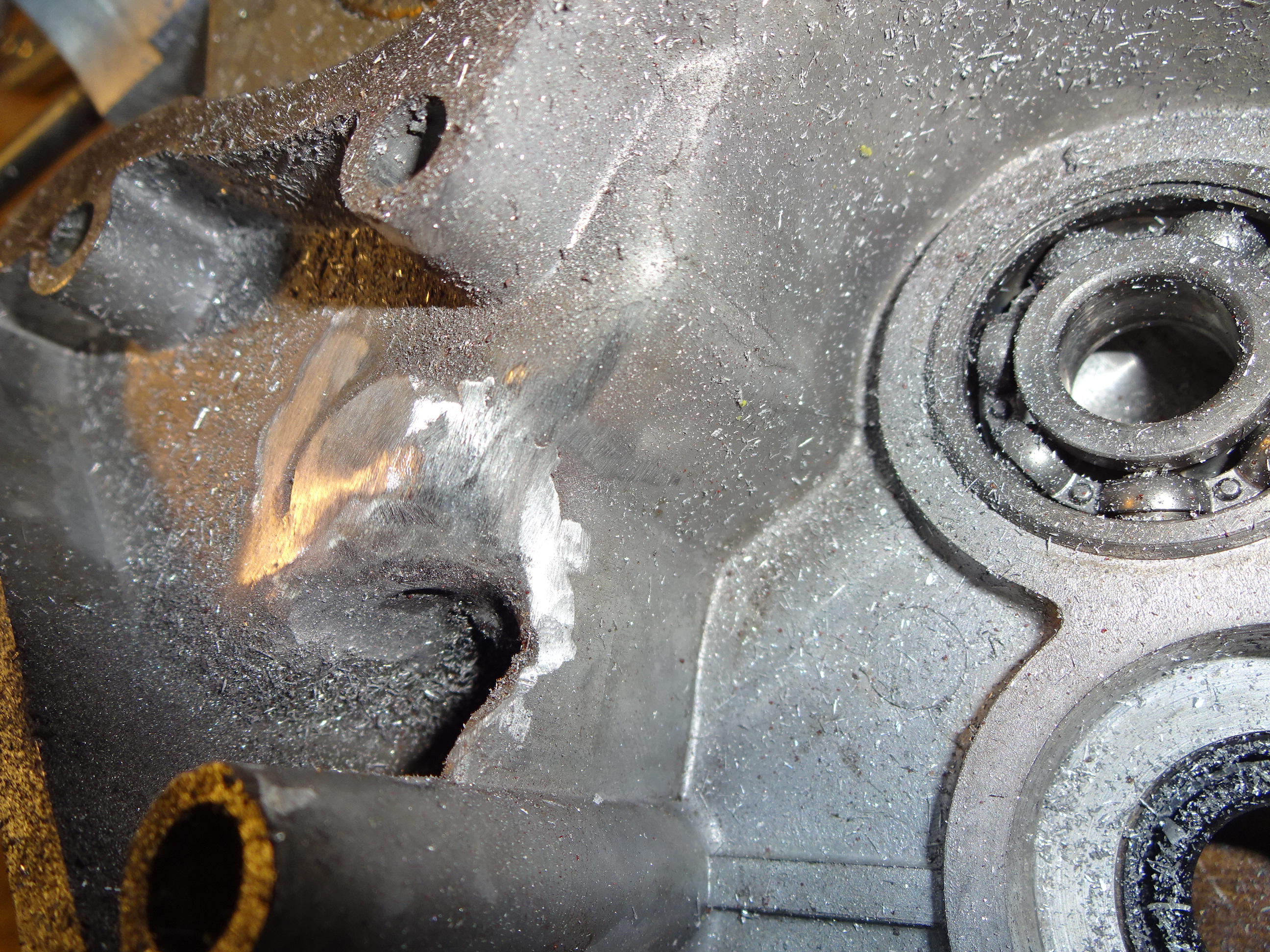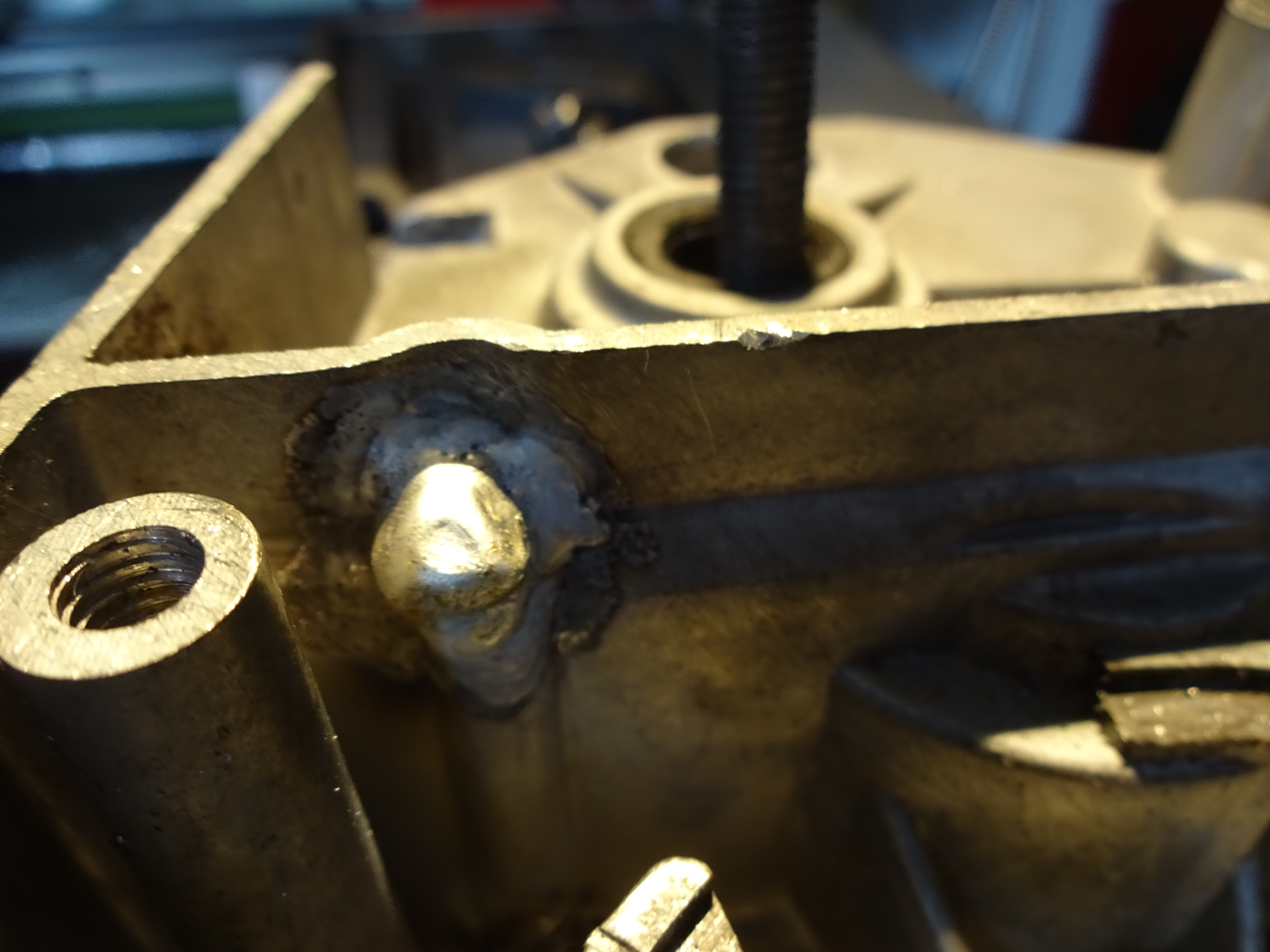 Da ich bei der Tiefe immer noch kein Loch finden konnte, hab ich versucht durch viel Messen die genaue Position zum „gegenbohren“ zu treffen. Ist mir zwar gelungen, aber beim letzten Bohrer bin ich zu tief geraten und hab mir das Gewinde geschrottet. Da ich keinen M4er Helicoilsatz besitze, hab ich nicht nur die Gegenseite wieder verschweisst, sondern auch das Gewinde.