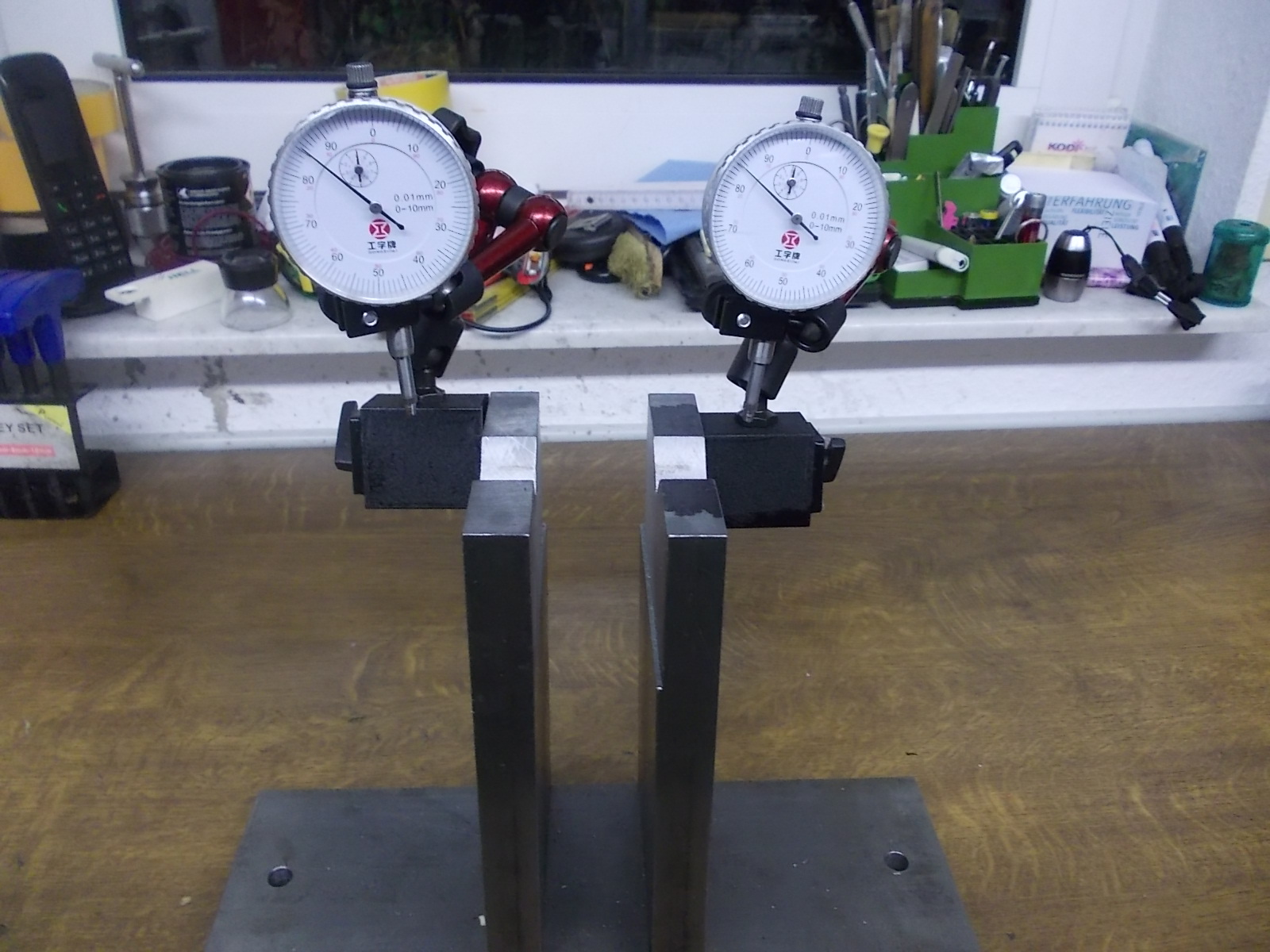 Klar jetzt geht es ans Richten der Welle. Dazu die Welle in die Hand und mit dem Kupferhammer drauf gehauen, ja doch es bewegt sich tatsächlich. Erster Versuch des Messens an der Drehbank zwischen den Spitzen war nicht so dolle. Erstens noch richtig was zu tun und irgendwie hatte ich das Gefühl, die Messungen sind nicht wiederholgenau. Recherche im Web öffneten mir die Augen, man presst die Welle tatsächlich auf ner Drehe zusammen. Kann man richtig messen