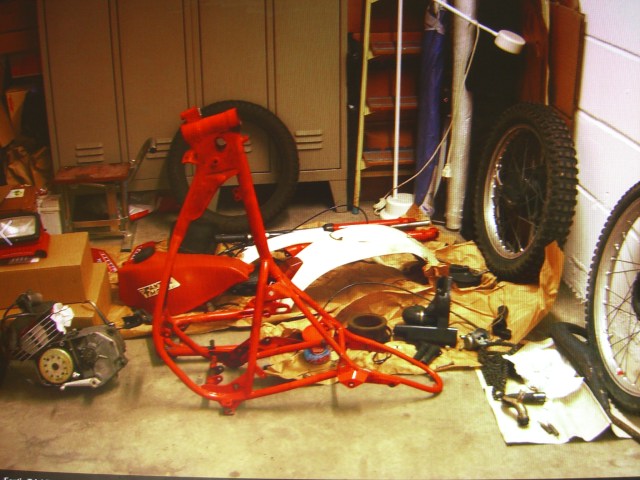 Nun mache ich sie schön. Hab erst mal alles zerlegt und gereinigt, wobei sich Petroleum mit Zahnbürste sehr bewährt hat. Erstaunlich war, dass überall noch die Originalschrauben verbaut worden, großteils sogar noch gelb verzinkt leuchtend !Hab alle Bowdenzüge, Bremsbeläge, Reifen, Schläuche, Hebel, Griffe, Lenkkopf-Radlager, etc. neu geordert. Gabel neue Simmerringe und Öl rein (es war auch keins mehr drin). Stoßdämpfer zerlegt. Dann Rahmen, Schwinge, Federn zum Pulvern gebracht: Verkehrsrot RAL 3020 und die Fußrasten, Ständer, Auspuff, etc. werden schwarz gepulvert. Krümmer neu schutzverchromt und viele Teile neu gelb verzinkt. Sitzbank neu bezogen. Die Plastics hab ich mit einer Poliermaschine aufgearbeitet. Schutzbleche habe ich Reproteile bekommen und sogar noch ein neues Originalrücklicht.