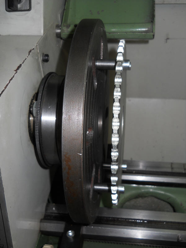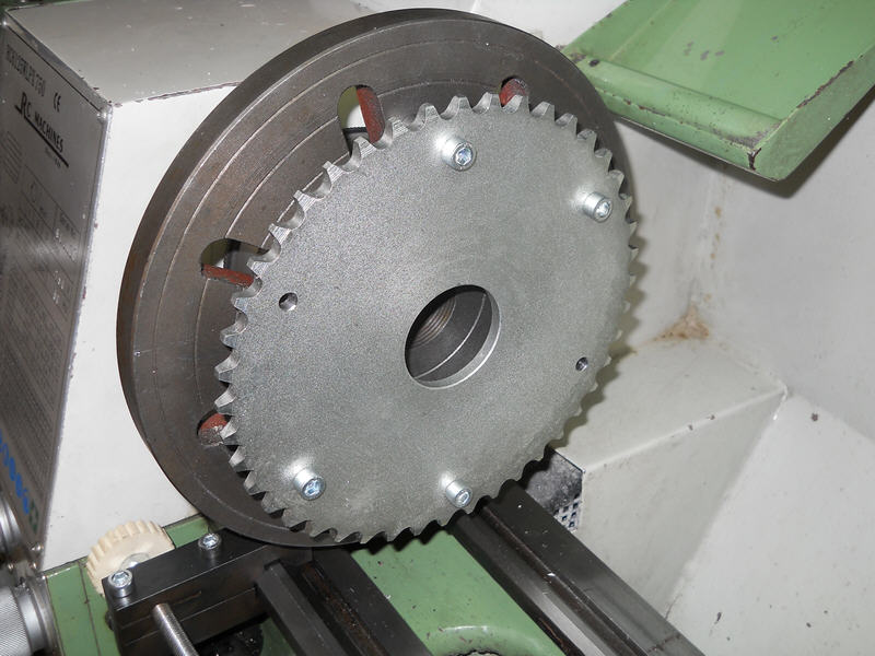 Dazu habe ich die große Planscheibe meiner Drehbank mit passenden Bohrungen und Gewinde versehen und Abstandshülsen dazu.