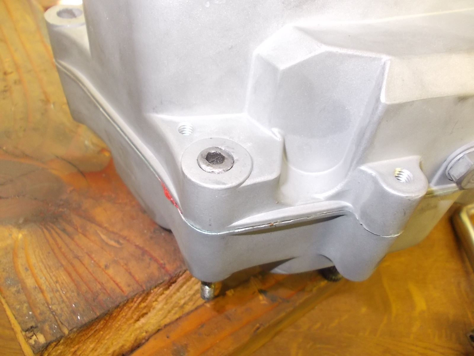 Ich fang mal an mit dem Ausbauen der drei Buchsen in den Motorengehäusen. Ohne die auszubauen, bekommt man ja die Hälften nicht geteilt. Ich benutzte dafür einfach lange M6 Inbusschrauben. Der Kopf passt ganz exakt auf die Buchse.