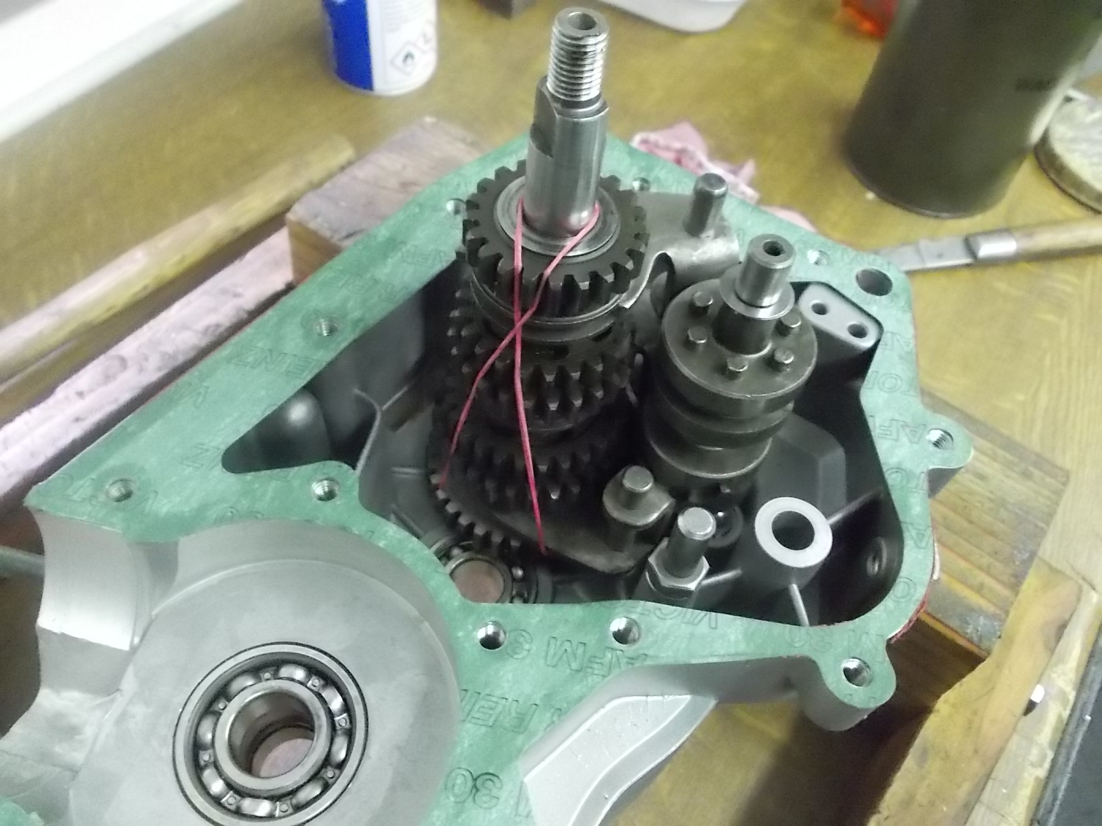 Dann noch ein kleiner Tipp wenn ihr die Getriebeausgangswelle mit der Schaltwalze und den Schaltgabeln einbauen wollt. Einfach zwei Gummis um die Welle und nichts fällt mehr auseinander. So kann man das Ganze ruhig einfädeln und nachher einfach die Gummis zerschneiden und rausziehen.