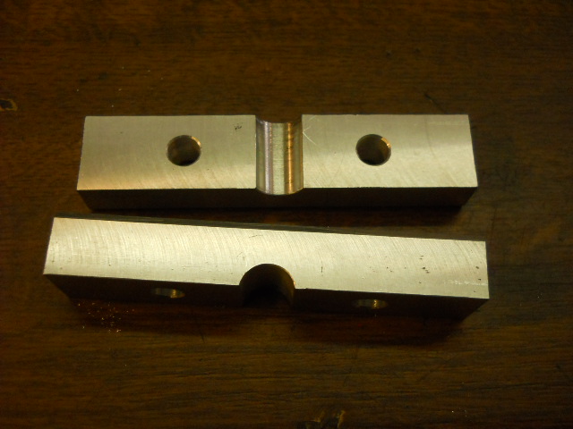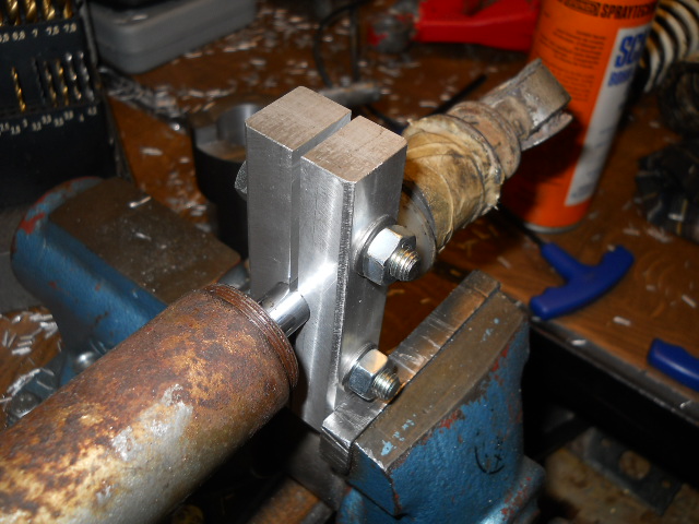 Um dann die Federbeinaugen von den Kolbenstangen zu bekommen hab ich mir ein Alumaterial genommen und ne 12mm Bohrung sehr fein gebohrt und mit guter Oberfläche ausgedreht. Das Teil der Länge nach durchgesägt und vorher noch mit Querbohrungen versehen. Das Ganze kommt dann nach dem Festziehen in den Schraubstock.
