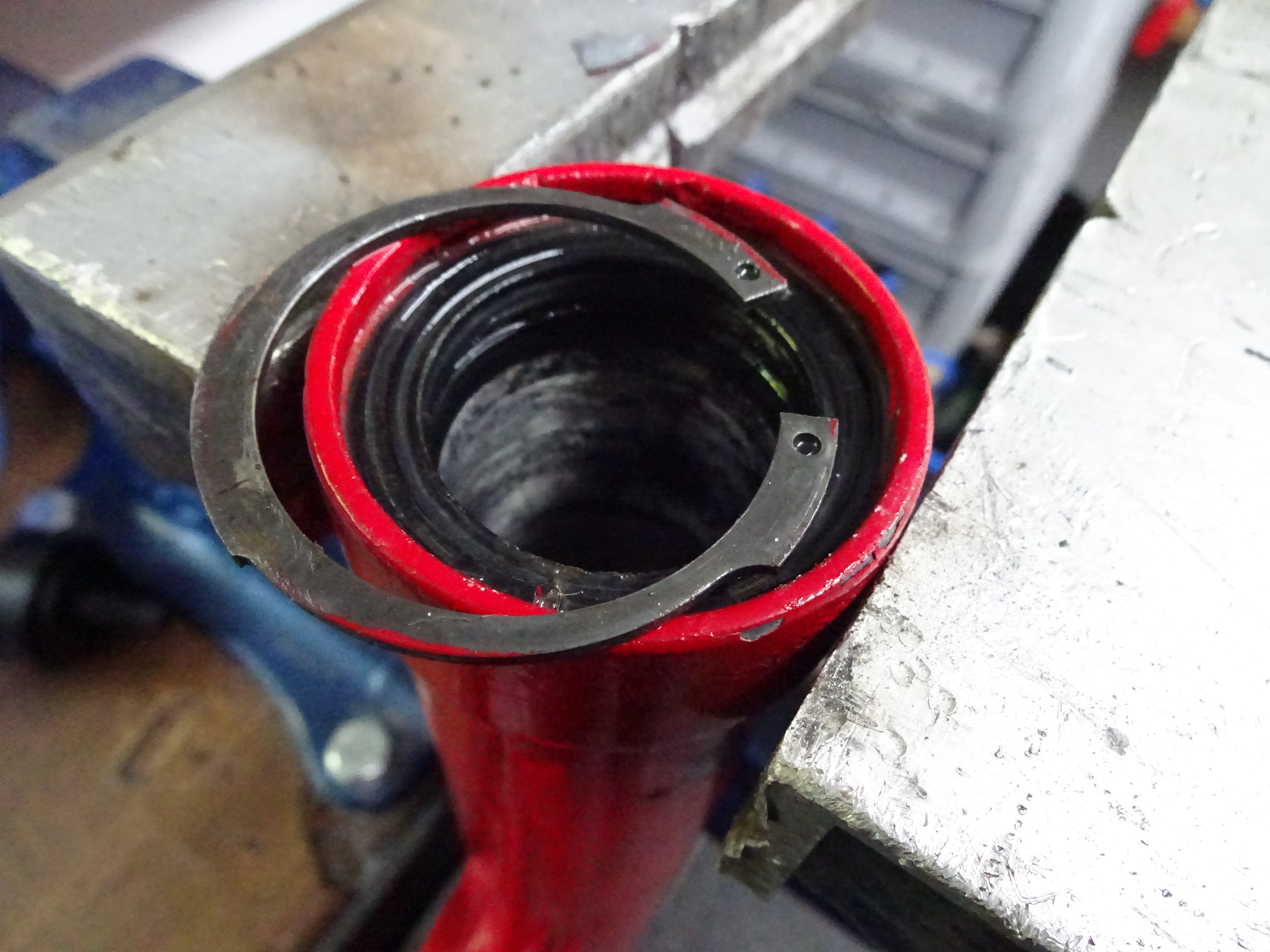 Zuerst einmal die Holme raus und die Kappen abgeschraubt. Bei einem Holm kam zuerst noch sauberes Gabelöl raus (hätte ich nicht erwartet), dann aber richtig schwarz. Der Zweite hatte nur schwarzes Gabelöl.