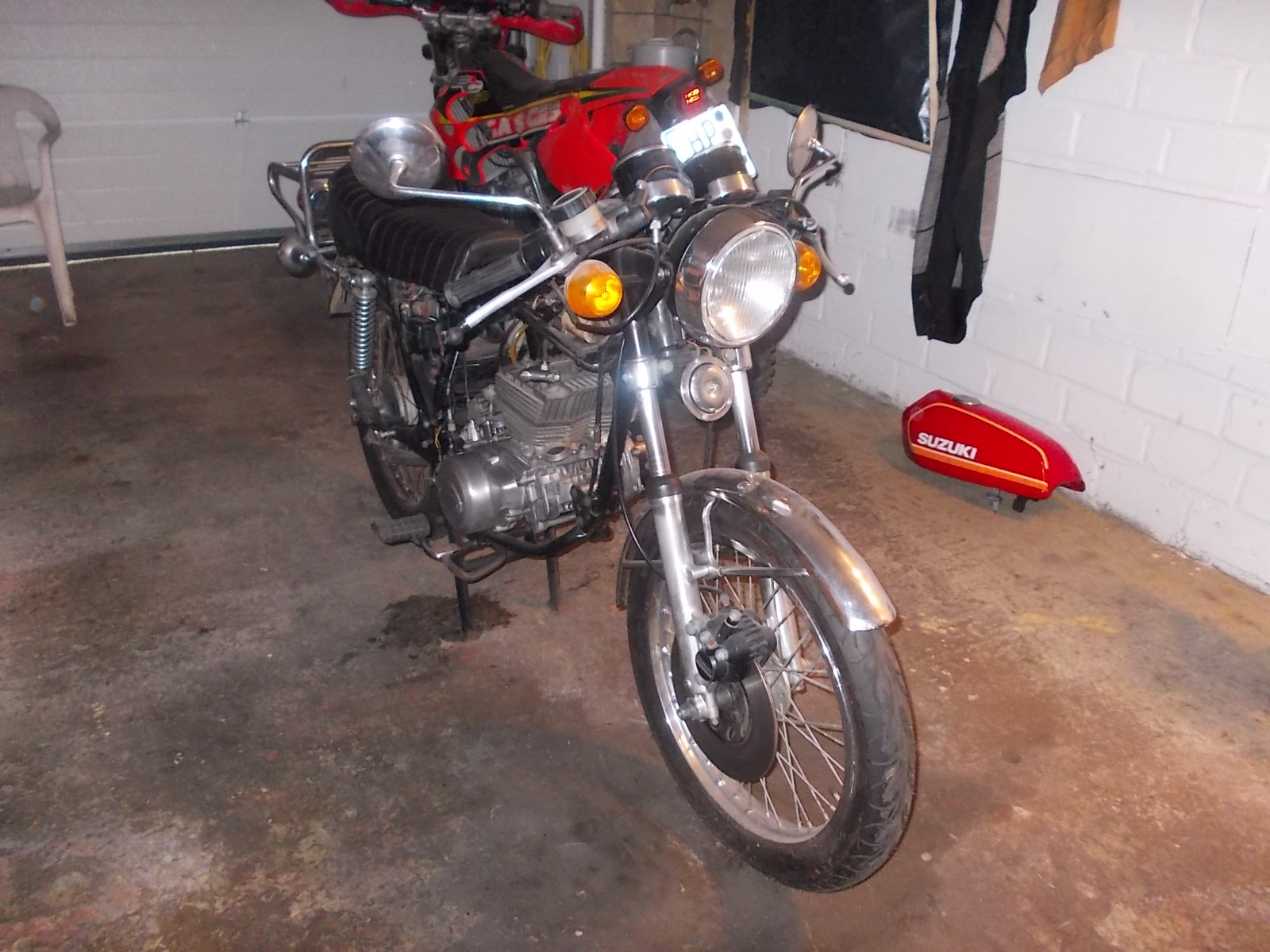 Diesmal den wieder gemachten Motor (Zylinder geschliffen und neue Kolben) in die Suzuki GT 185 gehoben