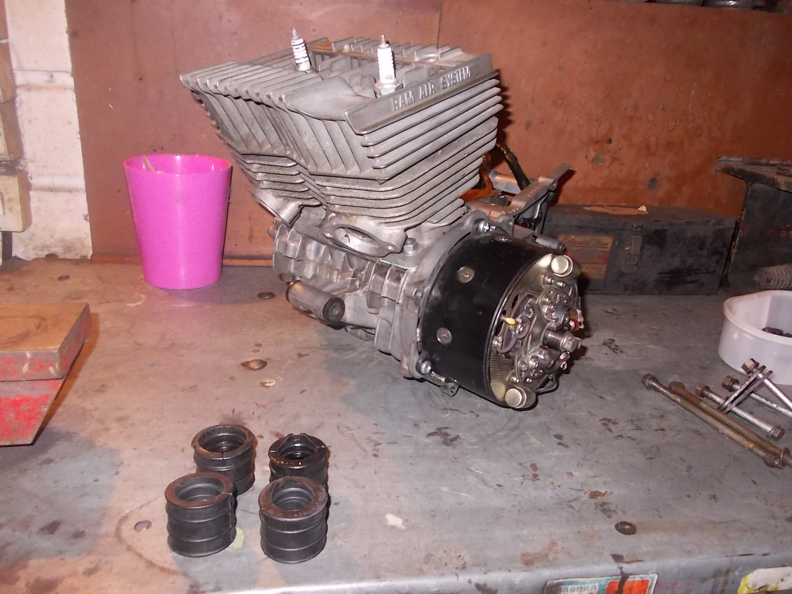 Diesmal den wieder gemachten Motor (Zylinder geschliffen und neue Kolben) in die Suzuki GT 185 gehoben