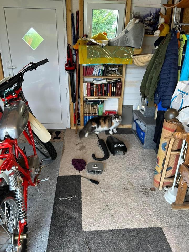 Jetzt bin ich auch tatsächlich fertig, bis alles erledigt ist dauert es doch immer ein Weilchen. Da schleift was, dann süppt der Vergaser oder Auspuff oder beides, Ständer zu kurz, Bremsen zu lasch, Sitzbank geht die Naht auf, Bedüsung kann optimiert werden etc. Ihr kennt das sicherlich ;)