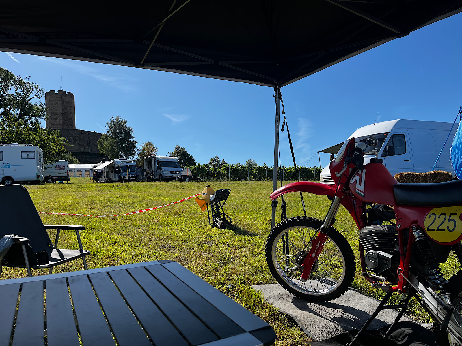 Bin ja früh hin und hab die Claims für Rolf und Rainer/Rüdiger abgesteckt. Kurze Zeit später kam noch die Karin Spiegel und wir haben gleich den Claim vergrößert damit neben dem Oli (der den Röth Ducati Nachbau dabei hatte) auch noch die Conny Scheck (Tochter von BMW Guru Herbert Scheck) Platz fanden.