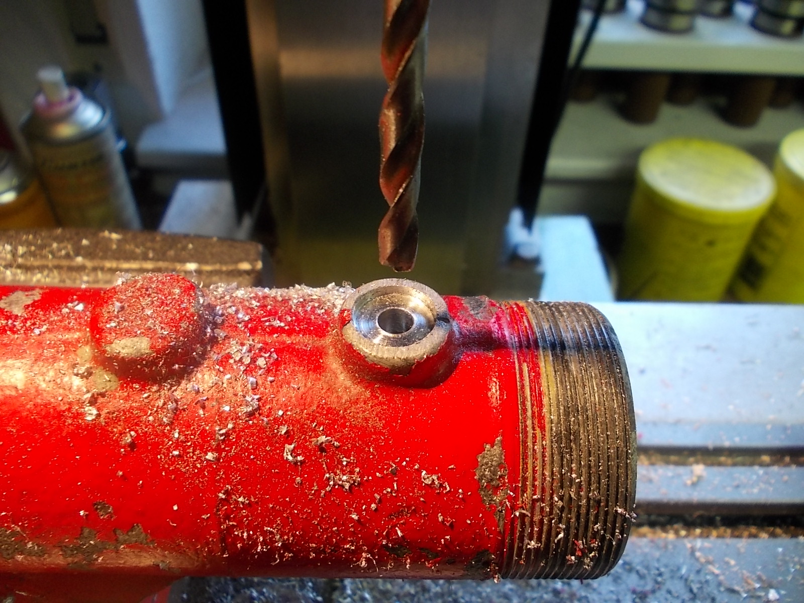 Ging ja mal gar nicht also ab unter die Fräse und erst ne plane Dichtfläche gefräst, dann auf Kerndurchmesser gebohrt und mit Maschinengewindeschneider in einem Rutsch das Gewinde rein.