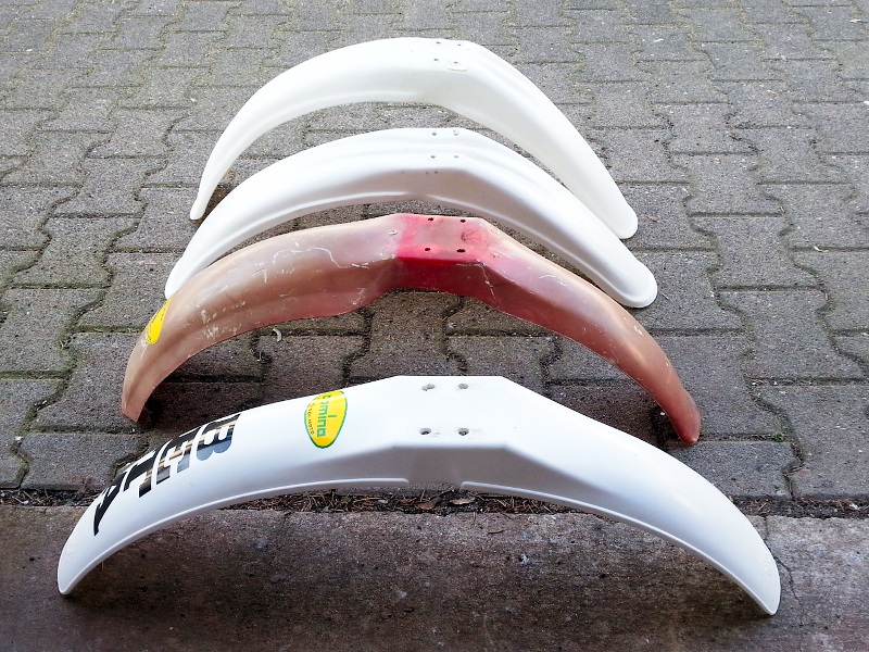 Der rote war ja dran (siehe Seite 1). Ist viel zu groß für die Gabel und hat mir von Anfang an nicht gefallen. Den zweiten von oben, hatte ich als Alternative für den obersten aus Novegro mitgebracht. Sieht aber ein bisschen wie Kindermoped aus. Im Februar habe ich zufällig den obersten zwischen weiterem Plastikschrott in Novegro entdeckt. Den hatte ich schon lange im www gesucht, weil der auch von Beta verbaut wurde (siehe Prospektbild Seite 1), konnte ihn aber nirgends finden.