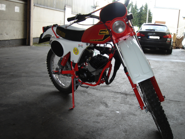 Plastikteile: Alle neu: Seitendeckel, Lichtmaske, hinterer KF, Vorderkotflügel wie Original Stilmotor A203 neu. Alle verzinkten Teile neu verzinkt wie Achsen Muttern Bremshebel, Fußrasten v+h, Schrauben Muttern Unterlagscheiben neu, Schwinge neue Nadellager+Simmerringe Gabel kpl. überholt, neue Simmerringe, neues Öl. Alle Aufkleber neu. Alle Züge neu, Brems+Kupplungsarmaturen neu mit Schutzgummis, Tacho und Welle neu, Gasgriff neu, Kickstarter neu, Gasgriff neu, Lenkradschloß neu. Luftfilterkasten original Aspes 50 RCR.