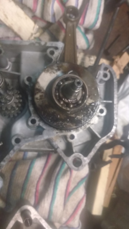 Ich hab sehr lange gebraucht, um den Motorblock auseinander zu bekommen. Die KW Lager sind auf der KW hängen geblieben, da sind sie jetzt noch. Der nächste Mist war, das Moped wäre keinen Meter gefahren. Das Ritzel war zwar draufgeschraubt, aber die Aufnahme ist so was von rund, da hält nix mehr. Musste erst einen massiven Grat an der Aufnahme wegpopeln bevor die Welle rausging. Aber alles nicht schlimm, hab ja noch Ersatz.