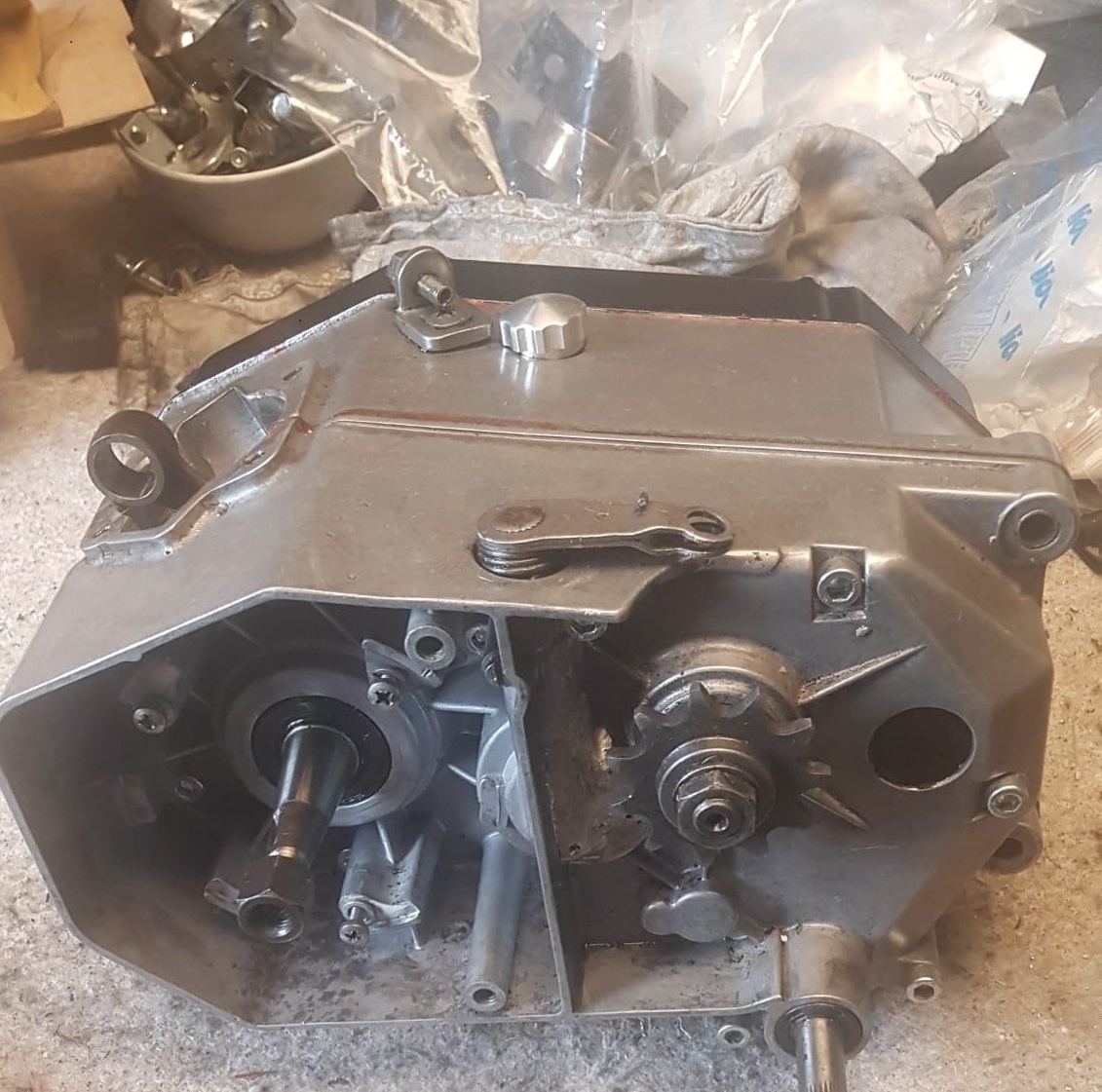 Den jetzigen UC6 haben wir Kupplungsseitig geöffnet um mal nen ersten Eindruck zu bekommen: Lager sind sehr gut, das noch rumsuppende Öl sieht neu aus (Verkäufer meinte, der Motor sei "gemacht" und hat damit richtig gelegen ;-) ), lässt sich gut durchschalten.