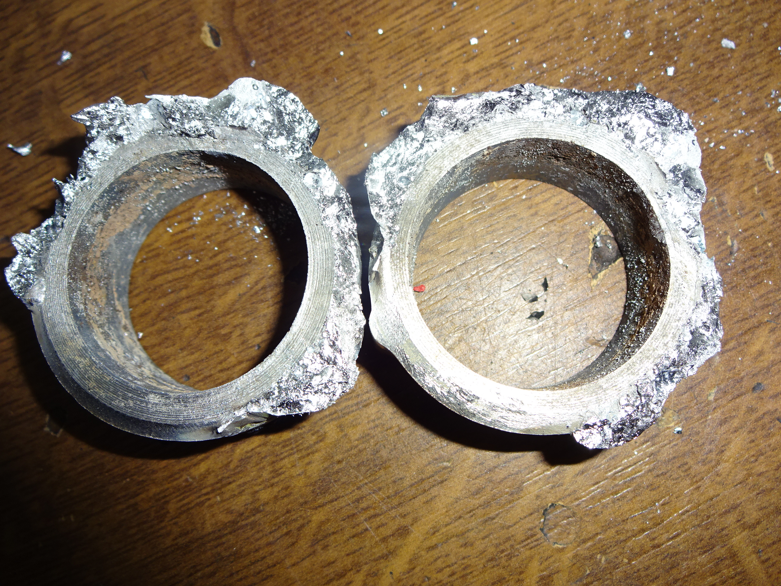 Jetzt Magnesium mit dem richtigen Schweisszusatz geschweisst, das wird was. Die Ringe im Schraubstock gequetscht, da reissen die Ringe aber die Naht nicht