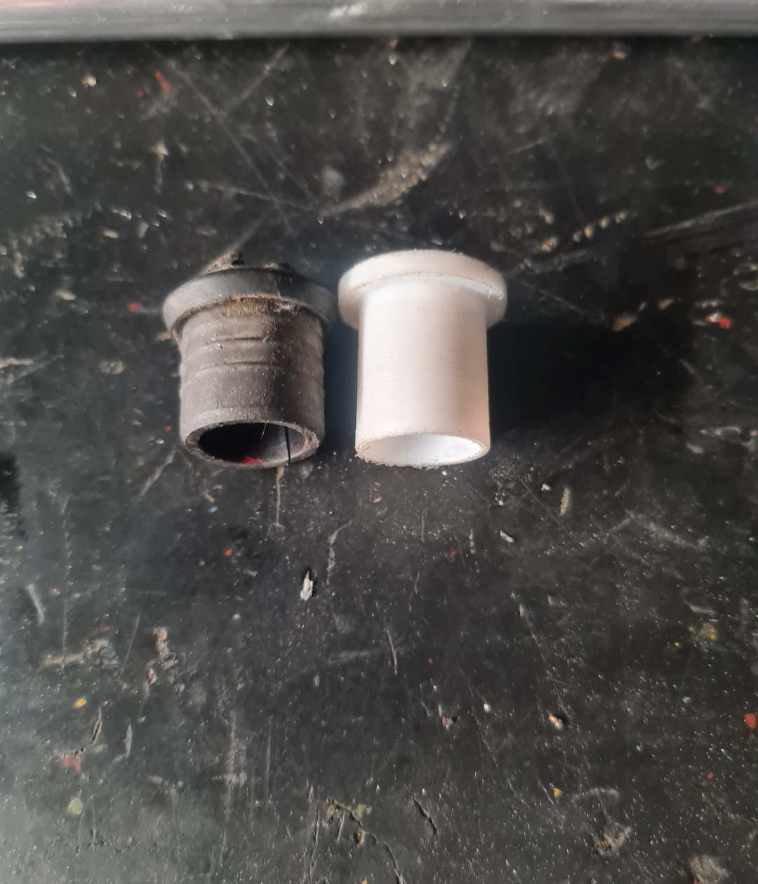 Die beiden defekten Anschlaggummis wurden gegen robuste Kunststoffteile aus unserer Drehbank getauscht.