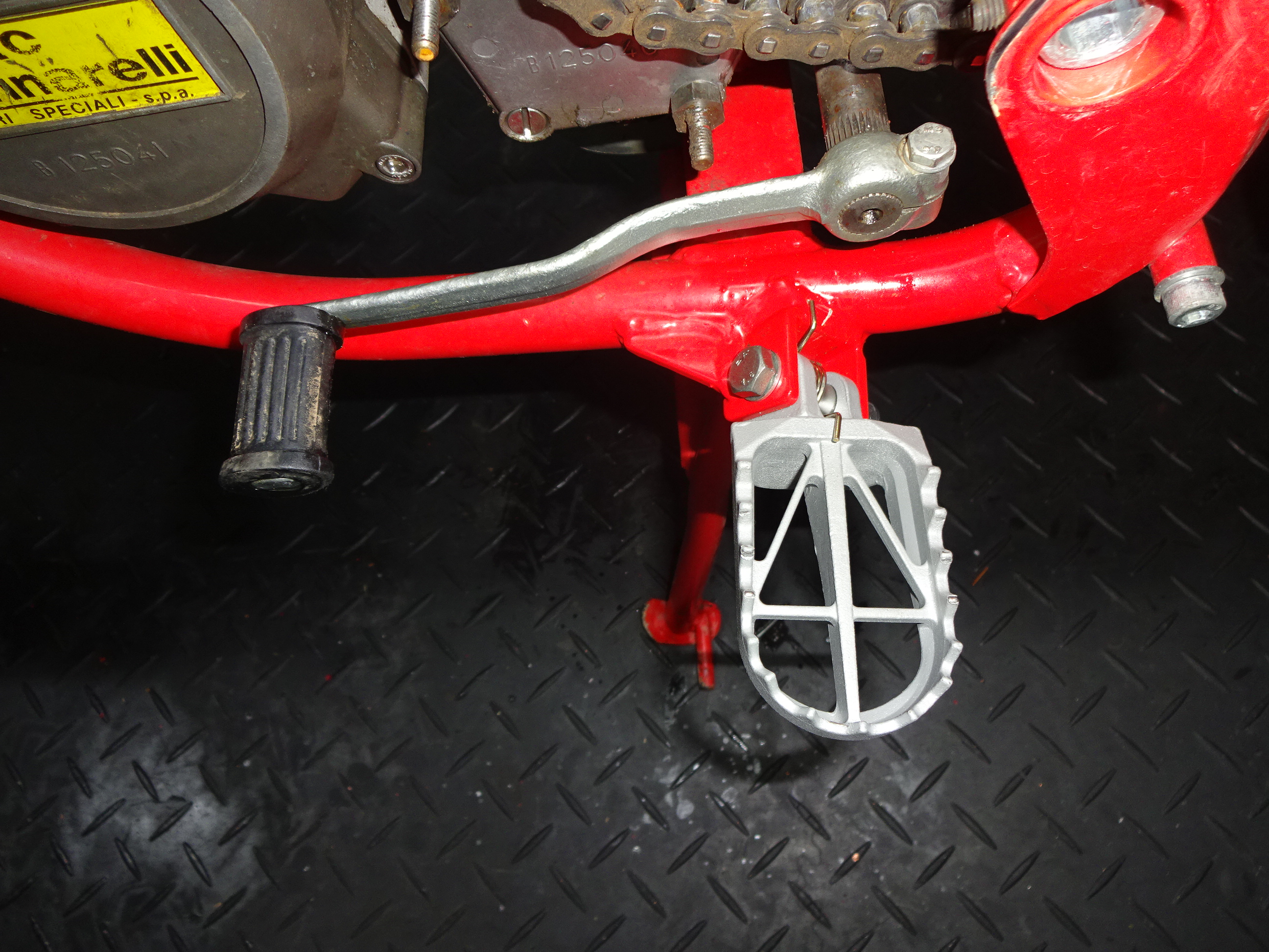 Dann noch die schmalen Originalrasten gegen welche von KiVo getauscht, die haben sich auf der Aprilia bestens bewährt. Hab nur minimal was mit der Feile wegnehmen müssen, dann passte der Winkel.