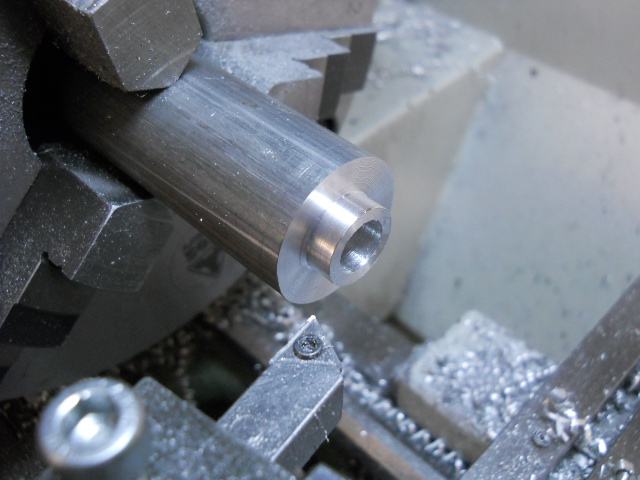 Trotzdem hab ich Bitubos die sich weiterhin weigern ihren Deckel herzugeben (sieht man auf den vorherigen Bildern, da ist noch ein verbogener Stahlstift zu sehen). Da hab ich mir eine Vorrichtung für die Planscheibe meiner Drehbank ausgedacht, wo ich die Federbeinaugen in einstellbaren Kegeln spannen kann. Geführt wird das Federbein dann noch von einer feststehenden Lünette.