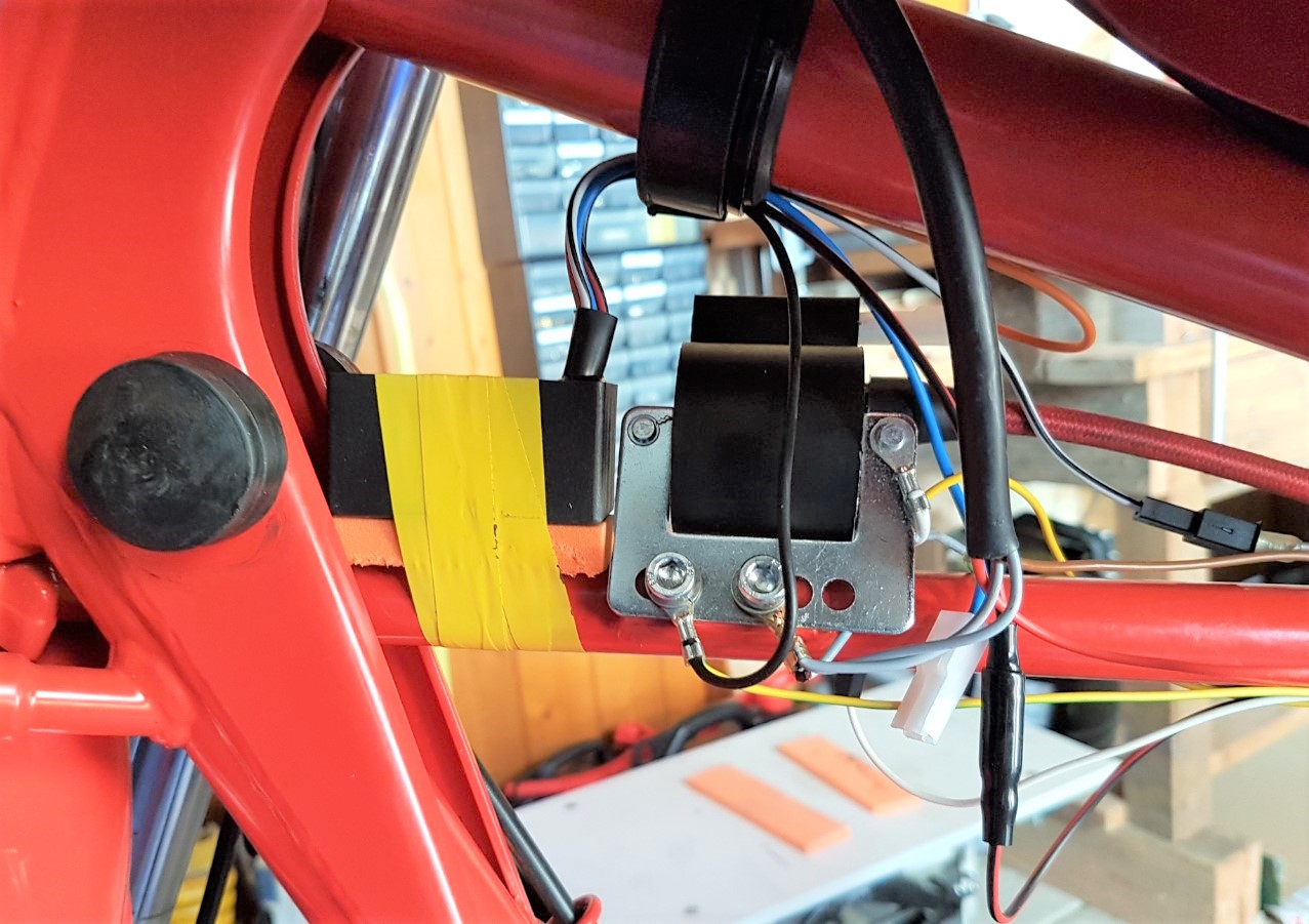 Der Stator wird dann so montiert, dass die Kabel vernünftig verlaufen und die Schrauben etwa mittig der Langlöcher sitzen. Die mitgelieferte Zündspule passt an den Platz der bisherigen RE1. Die CDI besitzt keine Halterung in Form eines Schraubenloches oder eines Montagewinkels oder dergleichen. Mit Moosgummi gepolstert habe ich die vor der Zündspule befestigt. Die Kabel werden noch hübsch verlegt...