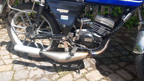 ich hab für den Bad Hersfelder Moped Marathon dann doch schnell den Corsa Corte Motor gegen einen normalen P4 mit dem 70 Kubik Polini Membranzylinder getauscht. Problem war da noch der Auspuff, also was zurechtgeschweißt und einen normalen 50er Auspuff draufgesteckt. Vergaser war der 19er drauf, den ich am Corsa Motor habe und geändert hab ich genau gar nix dran. Motor rein, Zündung vom Corsa Motor in den P4, so musste ich nix am Kabelgelerch ändern. Ritzel auch gleich, nix an der Kette geändert. Angekickt, läuft,hält Standgas, fährt. Kraft von unten raus, aber halt nur 55 Klamotten Spitze. 30 km Probefahrt, mehrmals die Kerze angekuckt. Eher zu dunkel als zu hell. Egal, besser so als oder so