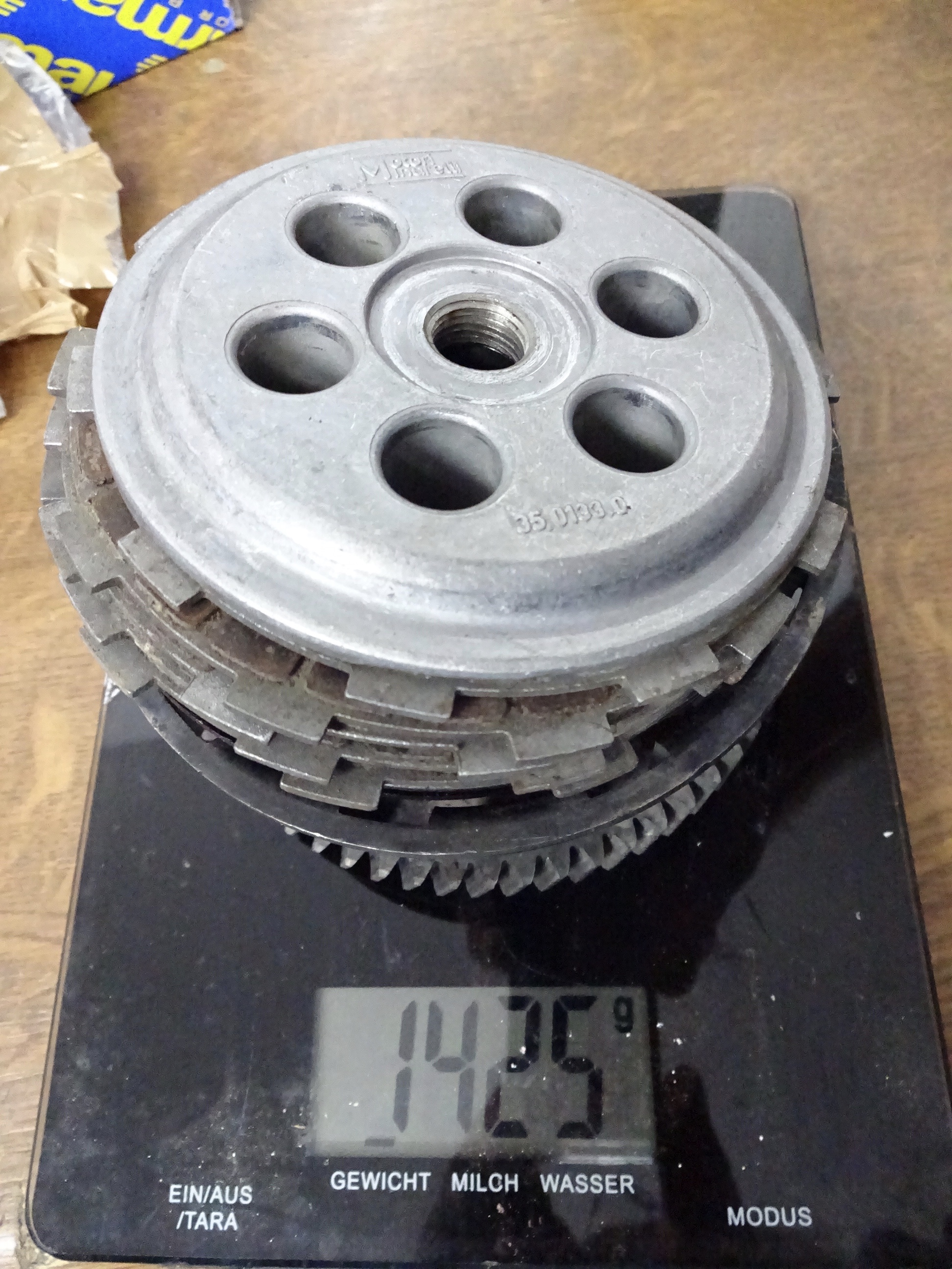 Am Samstag vor dem Pfungstadtrennen, haben ja Rolf und Michel bei mir übernachtet. Nach dem Essen hat Michel mal seine Wundertüte ausgepackt. Haben dann mal Bilder auf der Waage im Vergleich zu den Standardteilen gemacht, quasi nur die Hälfte an Gewicht Leichter Kupplungskorb inkl. Innenläufer Dateianhang: Dateianhang: Hier jetzt noch alles mit leichteren Reib- und Belagscheiben inkl. Druckplatte Dateianhang: Dateianhang: War echt beeindruckend wie leicht die Teile sind. Der Motor wird mit ner leichteren Zündung zusammen, sicherlich blitzschnell hochdrehen. Hm und wieder ist da dieser Haben-Wollen-Reflex. Kalle |