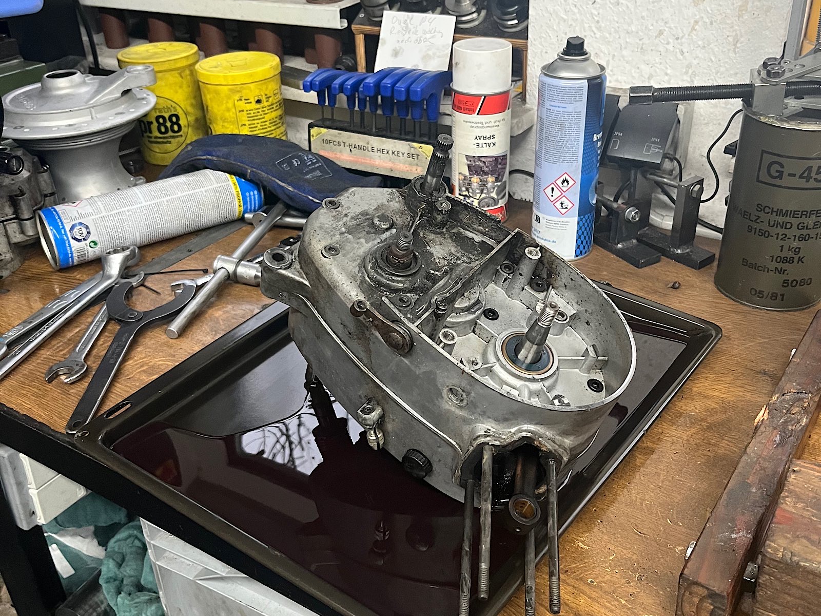 Beim ablassen des Getriebeöls zeigte sich, das wohl auch einiges im Kurbelgehäuse war. Denke da hat sich ein Dichtring verabschiedet und der Motor hat Getriebeöl gesagt. Erklärt auch den „ angebrannten“ Kurbelraum auf weiteren Bildern