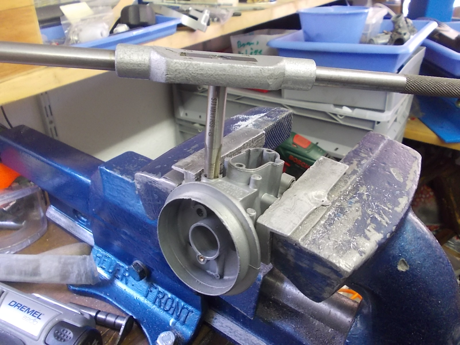 Ok jetzt muss wieder ein neues Gewinde rein, Mist ist Feingewinde M8 x 1,0. Also den Repsatz bestellen und warten.