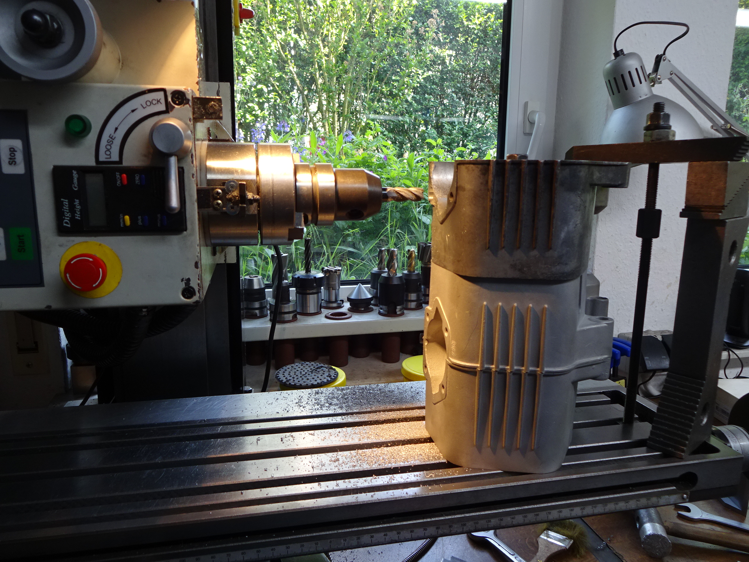 Musste bis auf 12mm ausfräsen, damit ich überhaupt ne saubere Bohrung bekomme. Da kommt jetzt ein Gewinde rein, damit ein Alustopfen rein geschraubt werde kann, der später noch verschweisst wird.