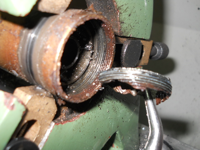 Hier sieht man was ich damit mache. Ich säge die rausgezogene Kolbenstange (eh verrostet) ab und schiebe den Rest zurück. Dann bei niedriger Drehzahl vorsichtig ausgedreht bis kurz vor das Gewinde. Dann kann man das Restgewinde mit nem kleinen Meißel (alter Schraubenzieher