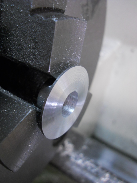 Trotzdem hab ich Bitubos die sich weiterhin weigern ihren Deckel herzugeben (sieht man auf den vorherigen Bildern, da ist noch ein verbogener Stahlstift zu sehen). Da hab ich mir eine Vorrichtung für die Planscheibe meiner Drehbank ausgedacht, wo ich die Federbeinaugen in einstellbaren Kegeln spannen kann. Geführt wird das Federbein dann noch von einer feststehenden Lünette.