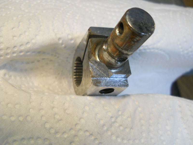 Da der Bolzen auf dem sich das Kickstarteroberteil dreht auch schon leidlich ausgeschlagen war, Hab ich einerseits das Unterteil mit dem Bolzen abgedreht und das Oberteil erst aufgebohrt und dann mit einer Bronzebuchse versehen. In diese dann eine passende Bohrung gebohrt und gerieben, so das der Bolzen jetzt schön darin läuft.