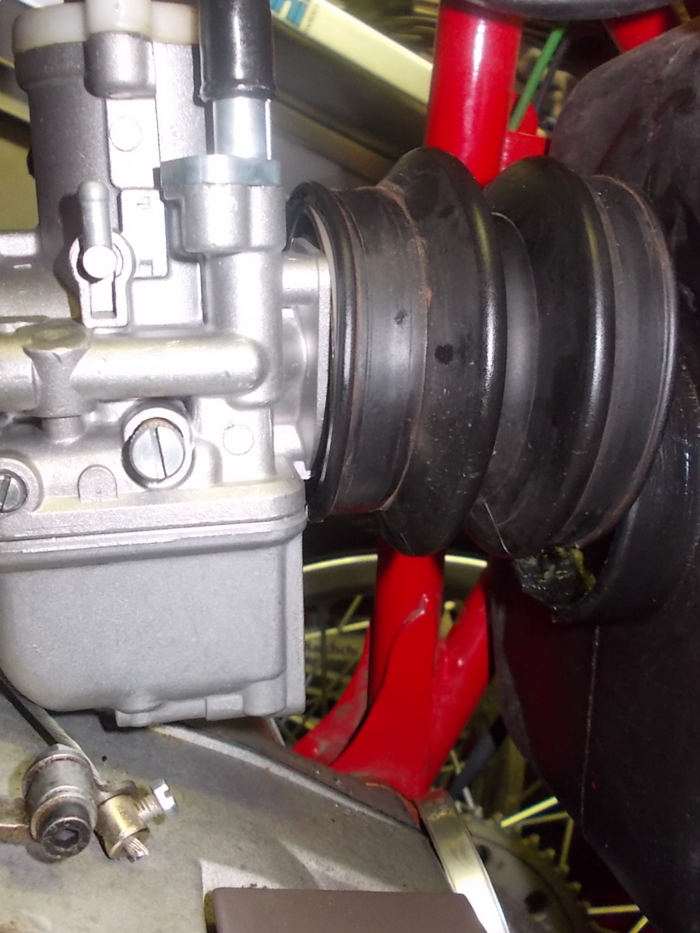 Hatte schon mal probiert einen 26er oder 28er Vergaser anzubauen, aber der Winkel von Vergaser-Ansaugstutzen war extrem steil. Jetzt hatte ich an Michel seiner RX einen gewinkelten Ansauggummi gesehen, den aber auch nicht in Novegro gefunden. Aber im Internet wurde ich fündig und zwar passt der von einem Aprilia Leonardo 125er Roller.