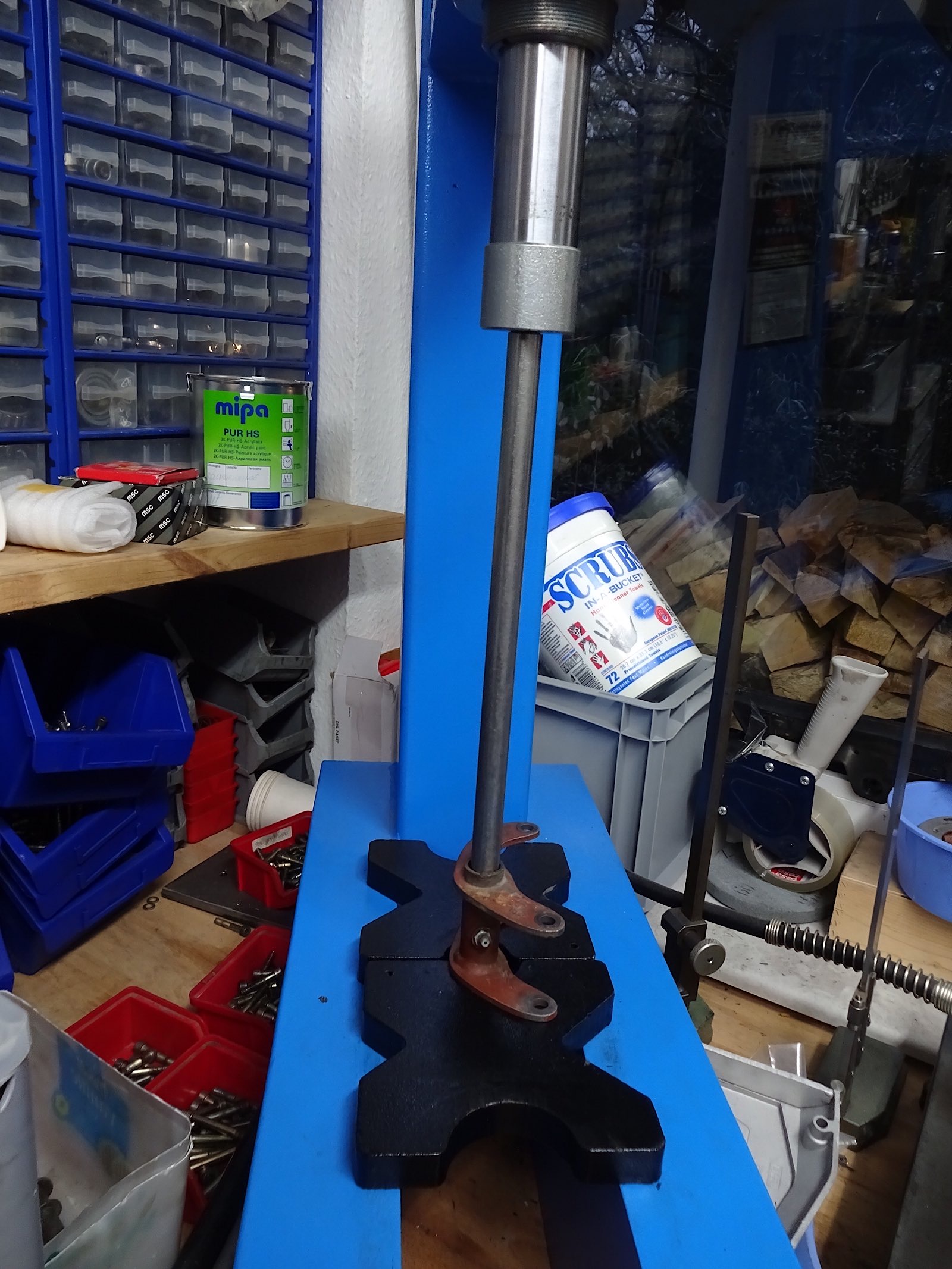 Jetzt die Silentbuchsen aus der Schwinge und die Buchse aus der Motorhalterung pressen. Der gute Heuer Front Schraubstock ist da Gold wert und den Rest auf der Presse.