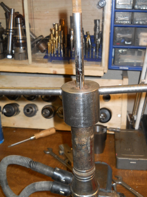 Ich hab mir für die Deckel der Bitubos ein Werkzeug gebaut um besser in die Stirmlöcher zu kommen. Bin selbst mit guten Stirnlochschlüssel immer wieder abgerutscht und hab mir die Löcher vermackt. Dieses Werkzeug kommt über die Kolbenstange (Federbeinauge ist schon entfernt) und wird vom Stoßdämpfer selbst geführt. Zum Öffnnen sind gehärtete Stahlstifte drin